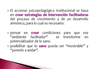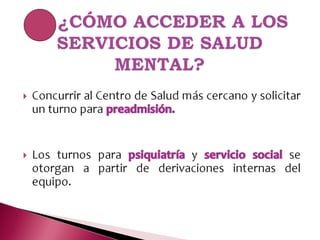 El documento describe el trabajo de psicopedagogía en el sistema de atención primaria de salud de la Municipalidad de General Pueyrredon. El área de psicopedagogía desarrolla su intervención en 11 centros de atención primaria con el objetivo de generar espacios que favorezcan el aprendizaje y mejorar su calidad a través de entrevistas, diagnósticos, tratamientos individuales y grupales, y talleres. Su trabajo se basa en un enfoque interdisciplinario como lo establece el modelo de atención pri