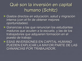 Este documento resume los principales conceptos relacionados con la inversión en capital humano a través de la educación. Explica que la educación representa una inversión que genera mayores ganancias para los trabajadores a lo largo de su vida laboral. Sin embargo, también argumenta que los sistemas educativos tienden a reproducir las desigualdades sociales y la ideología de la clase dominante. Diversos autores critican que la teoría del capital humano no considera suficientemente cómo la estructura de clases influye en los resultados educativos y sal