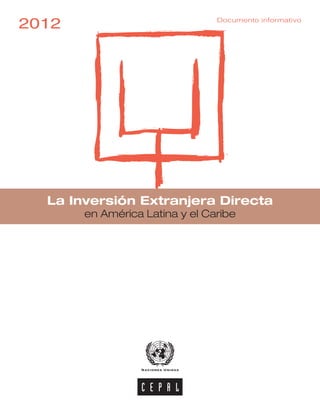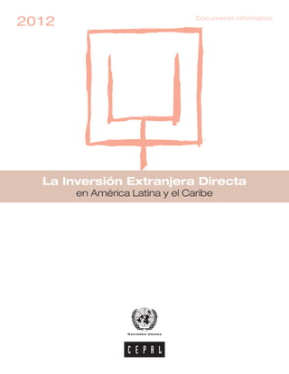 El documento resume las principales tendencias de la inversión extranjera directa (IED) en América Latina y el Caribe en 2012. Reporta que los flujos de IED a la región aumentaron levemente ese año, impulsados principalmente por los sectores de recursos naturales e industrias manufactureras. También analiza las dinámicas de origen y destino de la IED, las utilidades de las empresas transnacionales, y la IED en el sector agrícola y agroindustrial. Finalmente, presenta conclusiones clave sobre el panorama de la