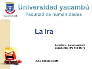 El documento describe la ira como una emoción que se expresa a través del resentimiento o la irritabilidad y tiene efectos físicos como el aumento de la presión arterial y los niveles de adrenalina. Explica que la ira es una respuesta cerebral diseñada para detener comportamientos amenazantes y que puede tener consecuencias físicas y mentales. También señala que las expresiones externas de la ira incluyen cambios en la expresión facial y postura, y en algunos casos, actos de agresión.