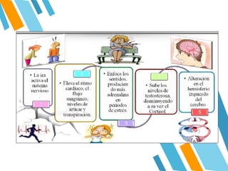 La ira es una emoción que se expresa a través del resentimiento o la irritabilidad y causa efectos físicos como aumento del ritmo cardíaco y la presión arterial. Existen diferentes tipos de ira como la precipitada, estable e intencionada, y recurrente. Aunque la ira puede motivar la corrección de conductas equivocadas, también puede ser destructiva y causar daño si no se expresa de manera apropiada. El tratamiento de la ira involucra terapias cognitivo-conductuales para crear conciencia sobre los impulsos