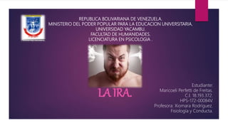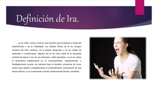 Este documento define la ira, describe sus expresiones y tipos, y analiza su localización en el cerebro, influencias en el aprendizaje, modificaciones y tolerancia, síntomas, y trastornos comunes. Explica que la ira es una emoción que aumenta el ritmo cardíaco y la presión arterial, y que puede expresarse de forma pasiva o agresiva. Además, identifica tres tipos de ira y tres tipos de respuesta, y analiza las consecuencias negativas que puede generar si no se gestiona de forma adecuada.