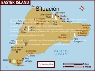 La isla de Pascua es una isla chilena en el Pacífico conocida por sus enormes estatuas de piedra llamadas moáis. La cultura rapanui que construyó los moáis se dividía en tribus gobernadas por un jefe supremo. Actualmente, la isla depende del turismo y se puede llegar en avión o barco desde Santiago de Chile o Tahití.