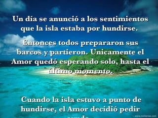 El documento narra una alegoría sobre el Amor y otros sentimientos como la Riqueza y el Orgullo. Cuando su isla se hunde, el Amor es el único que se queda esperando ayuda. Ni la Riqueza ni el Orgullo lo quieren llevar en sus barcos. Tampoco la Tristeza o el Buen Humor pueden ayudarlo. Finalmente, el Tiempo acoge al Amor y lo salva, porque solo él entiende la importancia del Amor.