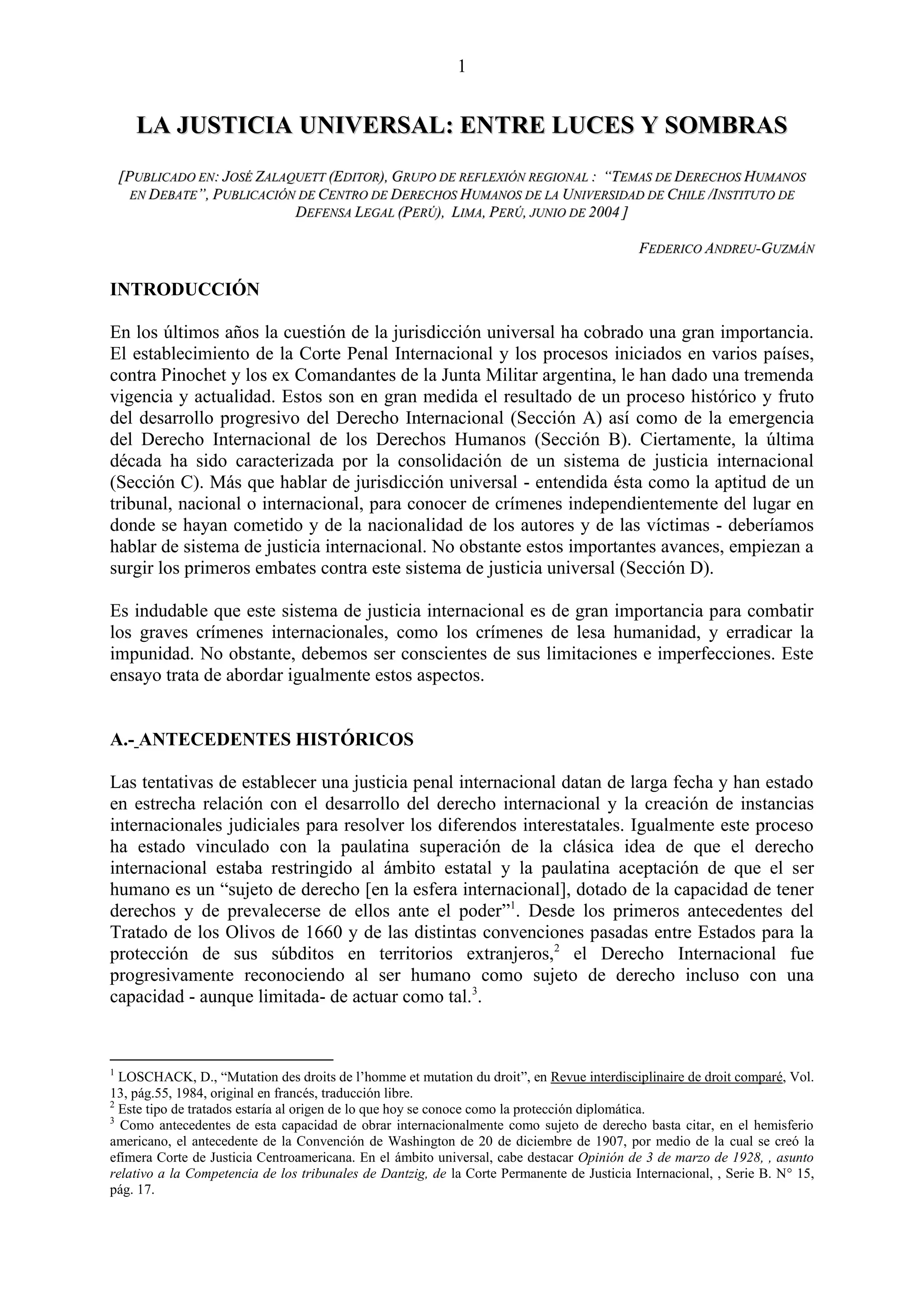 Este documento resume los antecedentes históricos de la justicia penal internacional y la jurisdicción universal, desde los primeros tratados en el siglo XVII hasta la creación de la Corte Penal Internacional a finales del siglo XX. Figuras como Grocio sentaron las bases de la noción de crimen internacional y la idea de que ciertos crímenes graves podían ser juzgados bajo el principio de jurisdicción universal. La Corte Permanente de Justicia Internacional reconoció en 1927 que la piratería podía ser juzgada bajo este principio.