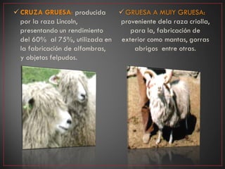 La lana es una fibra natural obtenida del pelo de las ovejas a través de un proceso de esquila. Químicamente está compuesta de proteínas llamadas queratina. Existen diferentes tipos de lana clasificados por su finura y la raza ovina de la que proviene. El proceso de esquila involucra cortar el pelo de las ovejas una vez al año para aprovechar la lana.