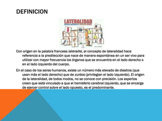 La lateralidad se refiere a la preferencia por usar los órganos del lado derecho o izquierdo del cuerpo. En los seres humanos, la mayoría son diestros, usando el lado derecho con más frecuencia. La lateralidad se cree que está vinculada a la dominancia del hemisferio cerebral izquierdo, que controla el lado opuesto del cuerpo.