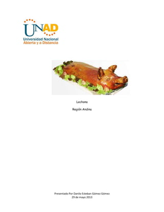 El documento describe la lechona, un plato tradicional de la región Andina de Colombia. Explica los orígenes árabes de la lechona y su importancia cultural en el departamento de Tolima. Luego proporciona la receta detallada para preparar una lechona, incluyendo los ingredientes, el proceso de adobo y cocción. El documento concluye que los alimentos de la región andina suelen estar equilibrados en grasas, sales y azúcares para lograr salud y energía.