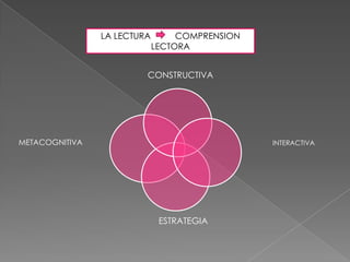 El documento habla sobre la lectura como un proceso constructivo, interactivo y metacognitivo. Explica que la lectura implica descifrar símbolos gráficos para construir y reconstruir significados e información a partir del texto. También menciona que la lectura es un proceso de construcción donde el lector va formando un modelo del texto según sus propias interpretaciones. Finalmente, resume que la comprensión de un texto es el resultado de un proceso regulado por el lector que implica iteraciones entre la información almacenada en su memoria y la que le