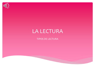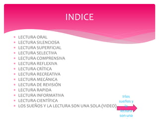 El documento describe los diferentes tipos de lectura, incluyendo lectura oral, silenciosa, superficial, selectiva, comprensiva, reflexiva, crítica, recreativa, mecánica, de revisión, rápida, informativa y científica. La lectura es el proceso de significación y comprensión mediante códigos como el lenguaje visual o táctil, y cada tipo tiene un propósito diferente como entretener, buscar información específica o analizar en profundidad el contenido.