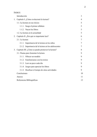 Este documento discute la evolución y la importancia de la lectura. Explica que la lectura ha evolucionado desde los primeros alfabetos hasta los libros impresos modernos. También describe la importancia de la lectura para el desarrollo de los niños y adolescentes y para la sociedad en general. Además, ofrece algunas recomendaciones para promover la lectura como ofrecer un modelo de lectura para los niños, familiarizarlos con los textos desde temprana edad y limitar el tiempo frente a pantallas.