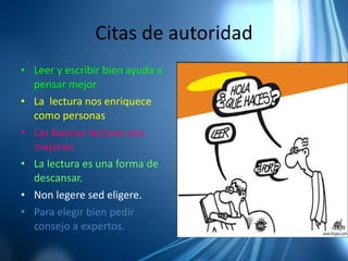 El documento destaca la importancia de la lectura para enriquecerse personalmente y pensar mejor. Señala que la lectura puede practicarse en cualquier momento y lugar, y nos libra de la soledad y depresión. También menciona que leer expone a las experiencias de otras personas y culturas, permitiendo un conocimiento amistoso de ellas. Finalmente, resalta que la lectura ayuda a las personas a construirse a sí mismas y a imaginar otros mundos.