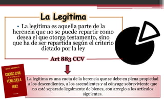 El documento explica los principios que rigen la legítima y el procedimiento para calcularla. En resumen: (1) La legítima es la cuota de la herencia que debe recibir los herederos forzosos como descendientes, ascendientes y cónyuges. (2) Para calcular la legítima se toma la mitad de los derechos que tendría cada heredero en una sucesión intestada. (3) Los herederos forzosos deben colacionar o imputar cualquier donación o legado recibido del causante para computar su parte en la herencia.