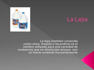 El documento discute los efectos de la exposición a la lejía en los niños. Indica que el riesgo de gripe y amigdalitis recurrente es mayor entre los niños cuyos padres usan lejía para limpiar el hogar. También señala que el riesgo de infecciones recurrentes en general es un 18% mayor entre los niños expuestos a lejía al menos una vez por semana. Finalmente, proporciona detalles sobre la composición química de la lejía, incluida su fórmula y cómo se sintetiza a