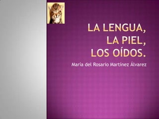 Este documento describe las funciones y estructuras de la lengua, la piel y el oído. La lengua es un órgano móvil en la boca que desempeña funciones como la masticación, deglución y lenguaje. Contiene papilas gustativas que detectan sabores. La piel contiene receptores sensoriales como corpúsculos que detectan tacto, temperatura y dolor. El oído captura ondas sonoras que viajan a través del oído externo, medio e interno hasta alcanzar el ór