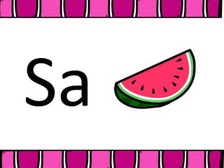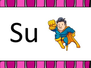 El documento presenta una serie de palabras que comienzan con las letras S, A, S, E, S, I, S, O y S, U respectivamente, seguidas de una historia corta sobre Sapi el Sapo que visita a su amiga Sonia la sapita, quien le sirve una sopa sabrosa que ambos disfrutan.