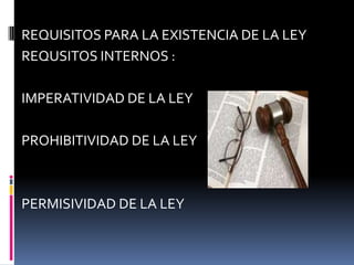 El documento describe los requisitos internos y externos de una ley válida. Los requisitos internos son que la ley sea imperativa, prohibitiva o permisiva. La ley es imperativa cuando obliga a realizar algo, prohibitiva cuando prohíbe la realización de un acto, y permisiva cuando reconoce los derechos de otras personas. El único requisito externo mencionado es que la ley debe ser una declaración de la voluntad soberana del estado democráticamente electo.