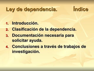La Ley de Dependencia de 2006 establece el Sistema Nacional de Atención a la Dependencia en España. Clasifica la dependencia en tres grados - moderada, severa y gran dependencia - y especifica la documentación necesaria para solicitar ayuda. Estudios de investigación muestran que las familias de personas con discapacidad intelectual no reciben suficiente apoyo de los servicios sanitarios y que muchas personas mayores viven solas con pocos recursos de apoyo.