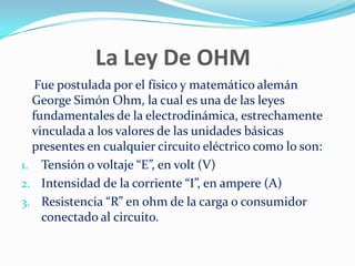 La ley de Ohm establece que la corriente eléctrica que circula a través de un conductor es directamente proporcional a la diferencia de potencial aplicada y es inversamente proporcional a la resistencia del material. El documento explica la ley de Ohm descubierta por George Ohm y cómo se puede comprobar mediante un circuito eléctrico, variando parámetros como la temperatura y el voltaje para ver su efecto en la corriente.