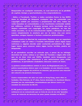 La ley estadounidense SOPA, que busca combatir la piratería en internet bloqueando sitios web que alberguen contenido con derechos de autor, ha generado un gran debate. Gigantes tecnológicos como Google y Facebook se oponen a la ley porque les daría al gobierno demasiado poder para censurar sitios web y porque podría afectar seriamente a plataformas de contenido generado por usuarios como YouTube y Facebook. El futuro de la apertura y libertad de internet está en juego con esta legislación.