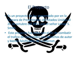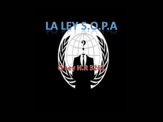 El documento describe un proyecto de ley presentado en 2011 llamado SOPA que buscaba combatir el tráfico de contenido con derechos de autor en Internet. Esto provocó protestas de sitios como Wikipedia y Reddit, así como propuestas alternativas como OPEN. Finalmente, el promotor de SOPA pospuso el proyecto hasta lograr un mayor consenso.