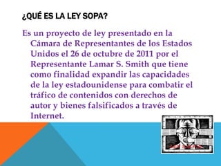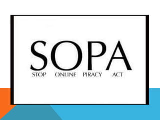 La Ley SOPA es un proyecto de ley presentado en 2011 en los Estados Unidos para expandir las capacidades legales de combatir el tráfico de contenido con derechos de autor y bienes falsificados en Internet. Aunque es una ley estadounidense, afectaría a usuarios de otros países debido a que la mayoría de servicios en línea son estadounidenses. Algunas compañías y organizaciones se oponen a la ley, incluyendo a Wikipedia, que considera realizar un "apagón del conocimiento" en protesta.