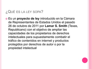 La Ley SOPA es un proyecto de ley introducido en 2011 en Estados Unidos que permitiría a propietarios de derechos de autor obtener órdenes judiciales contra sitios web que faciliten la infracción de derechos de autor, lo que podría resultar en el bloqueo de sitios web, la congelación de fondos y la eliminación de enlaces a sitios denunciados.