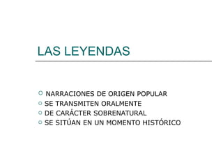 El documento habla sobre las leyendas, describiéndolas como narraciones populares transmitidas oralmente que buscan explicar fenómenos naturales o históricos. Menciona que las leyendas son anónimas, tienen diversas versiones y pertenecen a toda una cultura. Luego menciona algunas leyendas argentinas y pregunta si existen leyendas en Gualeguaychú, detallando brevemente la leyenda de su fundación y otra sobre una azotea. Finalmente pregunta sobre posibles leyendas en otros lugares.