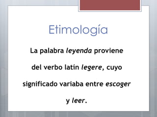 La leyenda es un relato ficticio basado en hechos históricos reales que forma parte del folclore de un pueblo. Sirve para explicar cómo una colectividad percibe su identidad y entorno, expresando sus deseos, temores e ideales. Las leyendas se caracterizan por mezclar lo verdadero con lo fantástico y proponer una moraleja, utilizando un lenguaje popular en espacios y tiempos reales. Existen diferentes tipos como las escatológicas, urbanas, histórico-culturales y