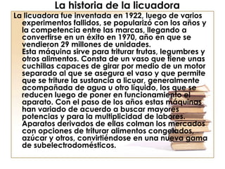 La licuadora fue inventada en 1922 y se popularizó en los años siguientes. Consta de un motor eléctrico conectado a un vaso con cuchillas giratorias que trituran los alimentos. A lo largo de los años, las licuadoras han mejorado su potencia y funcionalidad, convirtiéndose en electrodomésticos comunes en las cocinas.