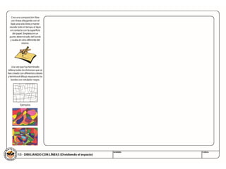 La línea se define como la representación gráfica de un punto en movimiento. Puede ser simple o compuesta y su forma, grosor, color y textura dependen de los materiales utilizados. Las líneas transmiten sentimientos e ideas a través de su dirección, intensidad y variaciones. Se usan para dividir el espacio, dar volumen con sombreados y crear texturas.
