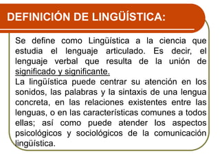 El documento define la lingüística como la ciencia que estudia el lenguaje articulado. Explica que la lingüística puede centrarse en los sonidos, palabras y sintaxis de una lengua, o en las relaciones entre lenguas y características comunes. Distingue entre lengua, habla, idioma, dialecto y otros conceptos clave. Finalmente, describe la gramática como el estudio de la estructura y reglas de una lengua.