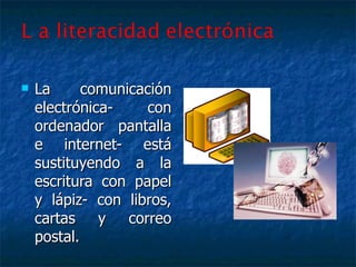 Este documento resume las principales características de la literacidad electrónica según Daniel Cassany, incluyendo el correo electrónico y el chat como nuevas formas de comunicación digital. También describe las habilidades requeridas para la literacidad electrónica y cómo permite el acceso a textos de diferentes idiomas y culturas. Finalmente, analiza rasgos distintivos del lenguaje en correos electrónicos y chats como la informalidad y la relajación ortográfica.