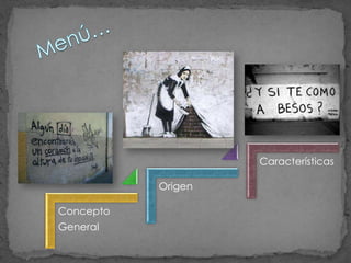 El graffiti se define como una forma de expresión libre y creativa que surge en contextos de opresión y revolución, inicialmente en París en 1968 y luego en Ecuador en el siglo XVIII. A través de diversos estilos, se utiliza para comunicar inconformidades sociales, políticas y artísticas, reflejando el descontento de la juventud que busca romper con el orden establecido. Este fenómeno se convierte en una crónica visual que denuncia, entretiene y abre espacios de diálogo en la sociedad.