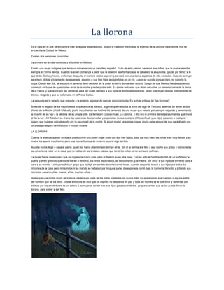 La leyenda de La Llorona se originó en la Ciudad de México. Existen dos versiones principales. La primera involucra a una mujer indígena cuyos tres hijos fueron ahogados en un río después de que su amante español la abandonó por una mujer española. Desde entonces, se escucha su lamento en el río. La segunda versión se refiere a una mujer que murió dando a luz y cuyo espíritu vaga lamentando la muerte de su hijo.
