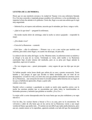 El primer documento resume una leyenda mexicana sobre La Llorona, una mujer que ahogó a su hija en el río y ahora vaga por las orillas llorando y buscando a su hija. El segundo documento cuenta la historia de una enfermera llamada Eva que murió perdida en las montañas de La Rumorosa y ahora se le aparece a la gente como un fantasma. El tercer documento describe la leyenda de San Pascualito, un monje esquelético que conduce una carreta llevándose a los moribundos.