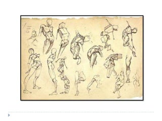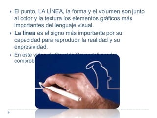 Este documento describe las propiedades y usos de la línea en el dibujo y la expresión visual. Explora las diferentes categorías de líneas basadas en su forma, posición, límites, trayectoria y finalidad. También explica cómo las líneas pueden transmitir significados y sensaciones, y cómo se pueden usar para definir contornos, sugerir volúmenes, crear texturas, movimiento y bocetos. En general, la línea es el elemento gráfico más importante para reproducir la realidad y expresarse visualmente.