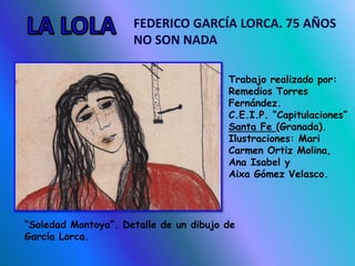 Este documento presenta un poema de Federico García Lorca titulado "La Lola" y propone actividades relacionadas con el poema y el oficio de las lavanderas. El poema describe a una mujer llamada Lola lavando pañales bajo un naranjo en flor mientras canta. Incluye ilustraciones de diferentes obras de arte que representan a lavanderas.
