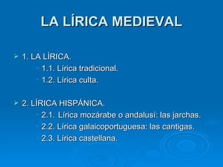 El documento resume los principales tipos de lírica medieval en la península ibérica. Describe la lírica tradicional anónima transmitida oralmente, con temas amorosos, y la lírica culta de autor conocido y más elaborada. Señala que la primera muestra hispánica son las jarchas mozárabes del siglo XI, poemas breves en lengua femenina sobre el amor. También analiza la lírica galaicoportuguesa, como las cantigas de amigo, y la castellana de temática amorosa en diferentes géneros