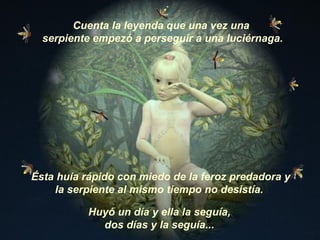 La historia cuenta el encuentro entre una luciérnaga y una serpiente. La serpiente persigue a la luciérnaga durante tres días sin descanso. Agotada, la luciérnaga le pregunta a la serpiente por qué la persigue si no le ha hecho daño y no es su presa. La serpiente responde que la persigue porque no soporta verla brillar. La moraleja es que a veces otros tratarán de lastimarnos no por algo malo que hayamos hecho, sino sólo porque nuestro brillo los molesta.