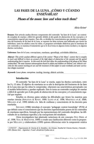 Este documento analiza cómo enseñar el complejo tema de las fases de la Luna. Explica los conocimientos fundamentales requeridos para comprender el fenómeno, como los movimientos de la Tierra, Luna y Sol. También describe ideas erróneas comunes y propone actividades didácticas. Finalmente, examina cómo se aborda el tema en libros de texto y planes de estudio.