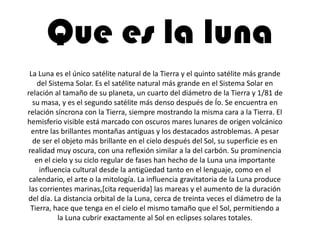 La Luna es el único satélite natural de la Tierra y el quinto satélite más grande del Sistema Solar. Mide un cuarto del diámetro de la Tierra y es el segundo satélite más denso después de Ío. La Luna siempre muestra la misma cara a la Tierra y su prominencia en el cielo ha tenido una gran influencia cultural desde la antigüedad.