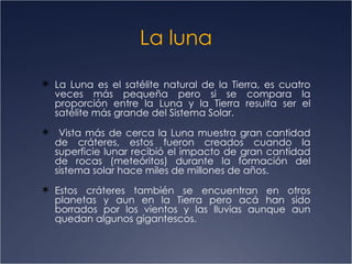 La Luna es el satélite natural más grande de la Tierra. Está cubierta de cráteres causados por impactos de meteoritos hace miles de millones de años. La Luna gira alrededor de la Tierra en aproximadamente 24 horas y 50 minutos, causando sus fases visibles desde la Tierra que cambian en un ciclo lunar.