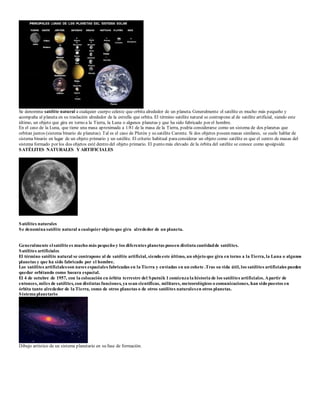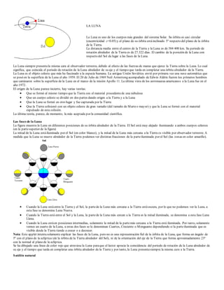 La Luna es uno de los objetos más grandes del sistema solar. Orbita la Tierra casi circularmente una vez cada 27 días, siempre mostrando la misma cara hacia la Tierra. Su origen probable fue la colisión de un gran objeto con la Tierra primitiva, formándose la Luna con el material eyectado. La Luna ha fascinado a la humanidad y fue objeto de las primeras exploraciones espaciales.