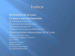 La Luna es el único satélite natural de la Tierra y siempre muestra la misma cara hacia nuestro planeta debido a su rotación síncrona. A pesar de su oscura superficie, es el objeto más brillante en el cielo nocturno. La Luna completa una órbita alrededor de la Tierra cada 27 días y su movimiento combinado con la rotación terrestre hace que se retrase su salida unos 50 minutos cada día. El 41% de su superficie nunca es visible desde la Tierra.