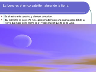 La Luna es el único satélite natural de la Tierra, con un diámetro aproximadamente una cuarta parte del de la Tierra. Existen varias teorías sobre el origen de la Luna, incluyendo que fue capturada por la gravedad de la Tierra o que se formó a partir de material eyectado durante un impacto en la Tierra temprana. La Luna rota sobre su eje y orbita la Tierra en aproximadamente 27 días, mostrando siempre la misma cara. Las fases lunares ocurren debido a cómo la iluminación solar incide en la Luna según su posición relat