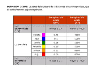 El documento proporciona información sobre conceptos básicos de la luz como la definición, características de las radiaciones electromagnéticas, magnitudes fundamentales como el flujo luminoso e intensidad luminosa. También describe diferentes tipos de lámparas como las incandescentes, fluorescentes, de vapor de mercurio y sodio, e incluye información sobre su rendimiento, vida útil y características.