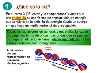 El documento explica las propiedades básicas de la luz. La luz es una forma de radiación electromagnética que se propaga en forma de ondas a una velocidad de 300.000 km/s en el vacío. La luz presenta tres propiedades principales: se propaga en línea recta, se refleja al chocar con superficies y se refracta o desvía al pasar de un medio a otro.