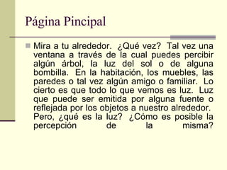 El documento define la luz como una porción del espectro electromagnético que podemos percibir. Explica que la luz se comporta como una onda y como una partícula dependiendo del experimento. Relata las ideas antiguas sobre la luz como partículas o rayos y cómo los descubrimientos de Young, Maxwell, Planck y Einstein llevaron al entendimiento moderno de la doble naturaleza de la luz. Finalmente, detalla experimentos históricos para medir la velocidad de la luz y su relación con la energía e intensidad.