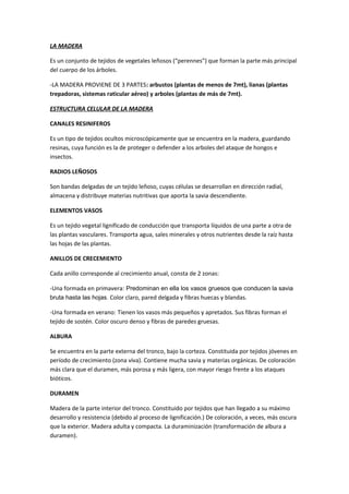 La madera proviene de árboles, arbustos y lianas. Está compuesta de tejidos como canales resiníferos, radios leñosos y elementos vasos que transportan agua y nutrientes. La madera se compone de albura externa de color claro y duramen interno más oscuro. También contiene anillos de crecimiento anuales, corteza y cambium. Sus propiedades como color, dureza y peso varían según la especie y factores como la humedad. La madera se utiliza comercialmente de coníferas y latif